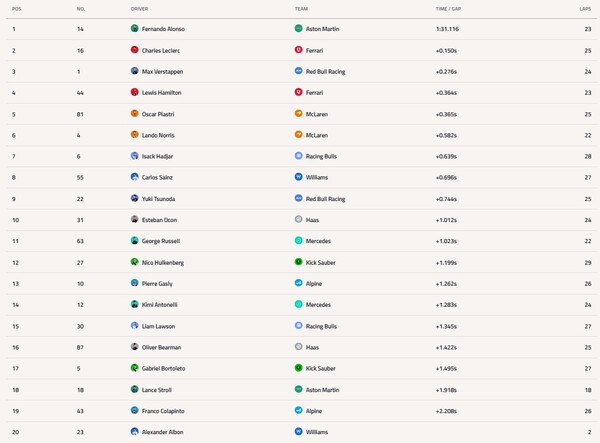 La primera sesión finalizó con el asturiano en cabeza de la clasificación. El veterano #14 llevó tras 23 giros al Aston Martin hasta el 1:31.116. La sesión no tuvo demasiados incidentes, aunque si que vivió un momento de incertidumbre causado por el incendio en los frenos traseros del Williams del piloto británico-tailandés Alex Albon, que solo pudo dar 2 vueltas completas antes de tener que entrar y despedirse de su participación en la FP1. Ya desde la primera toma de contacto con el asfalto se ha notado el calor y se han visto instalados y equipados los dispositivos conformados para cumplir la normativa ‘Heat Hazard' de la FIA.