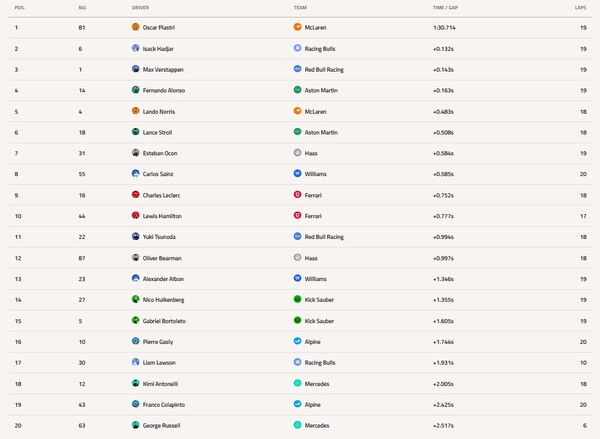 En ella hemos visto hasta un total de dos banderas rojas, un buen puñado de amarillas y se han podido divisar los primeros contactos fuertes contra el muro, como el del RB de Liam Lawson en la penúltima curva para desllantar las ruedas del eje derecho de su monoplaza. Por otra parte, se vio algo poco habitual, un choque entre Lando Norris y Charles Leclerc en el pit lane.
